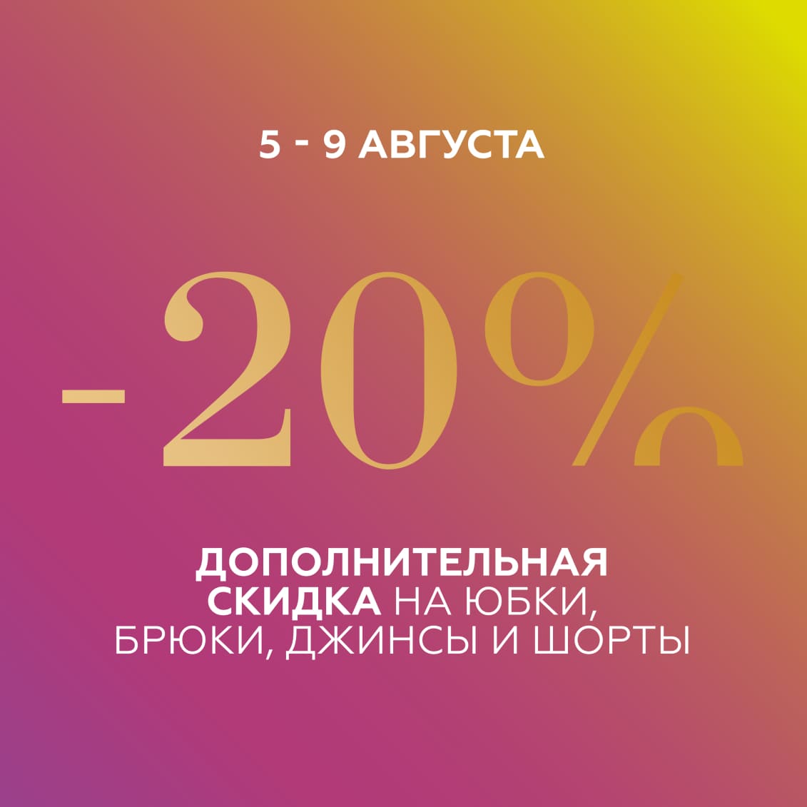 Дополнительная скидка на юбки, брюки, джинсы и шорты.